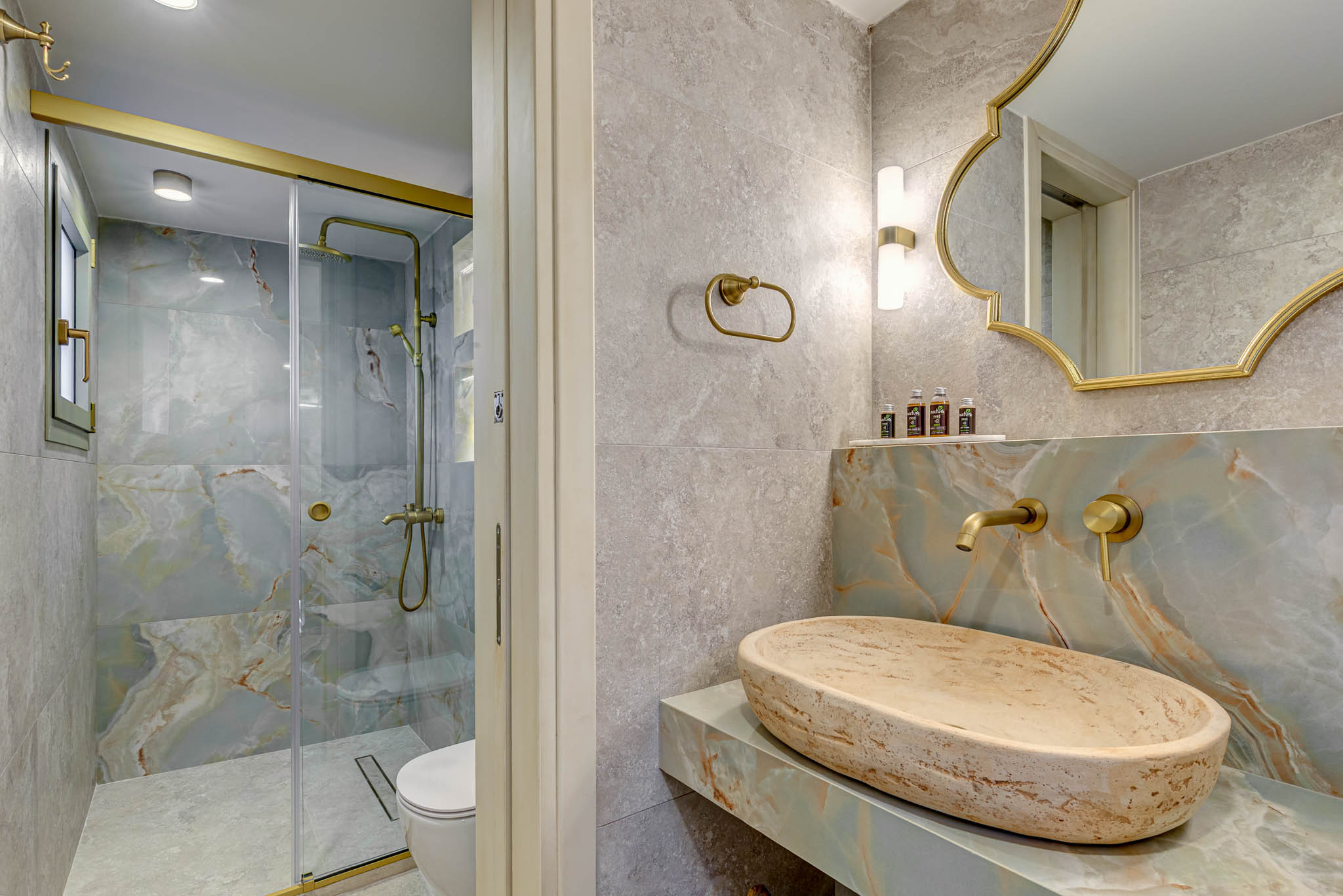 • Spa-worthy bathroom: sculpted stone basins, bespoke wooden vanities, brushed-gold fixtures and hand-painted heritage tiles; a walk-in rainfall shower delivers pure holiday bliss.