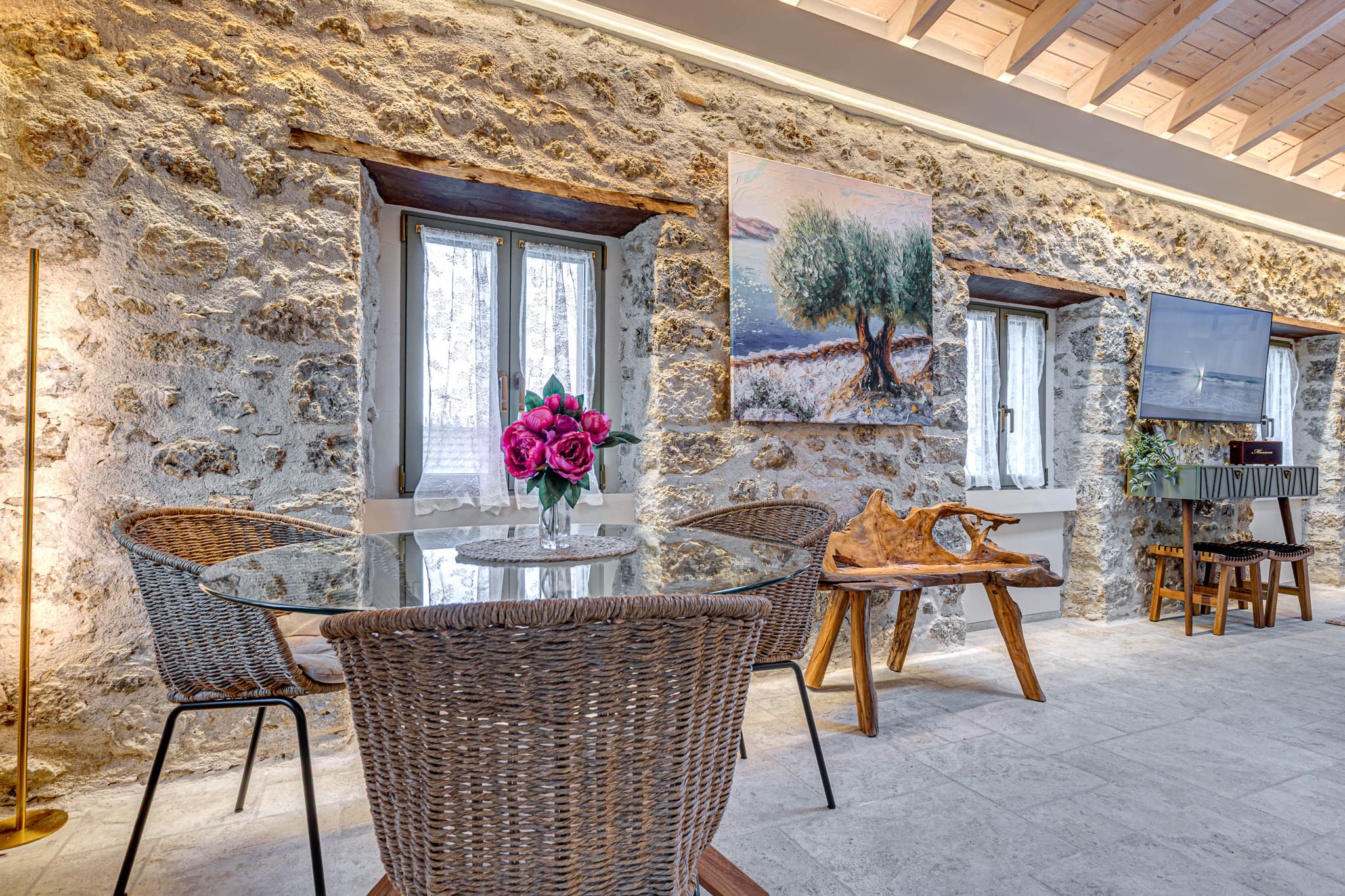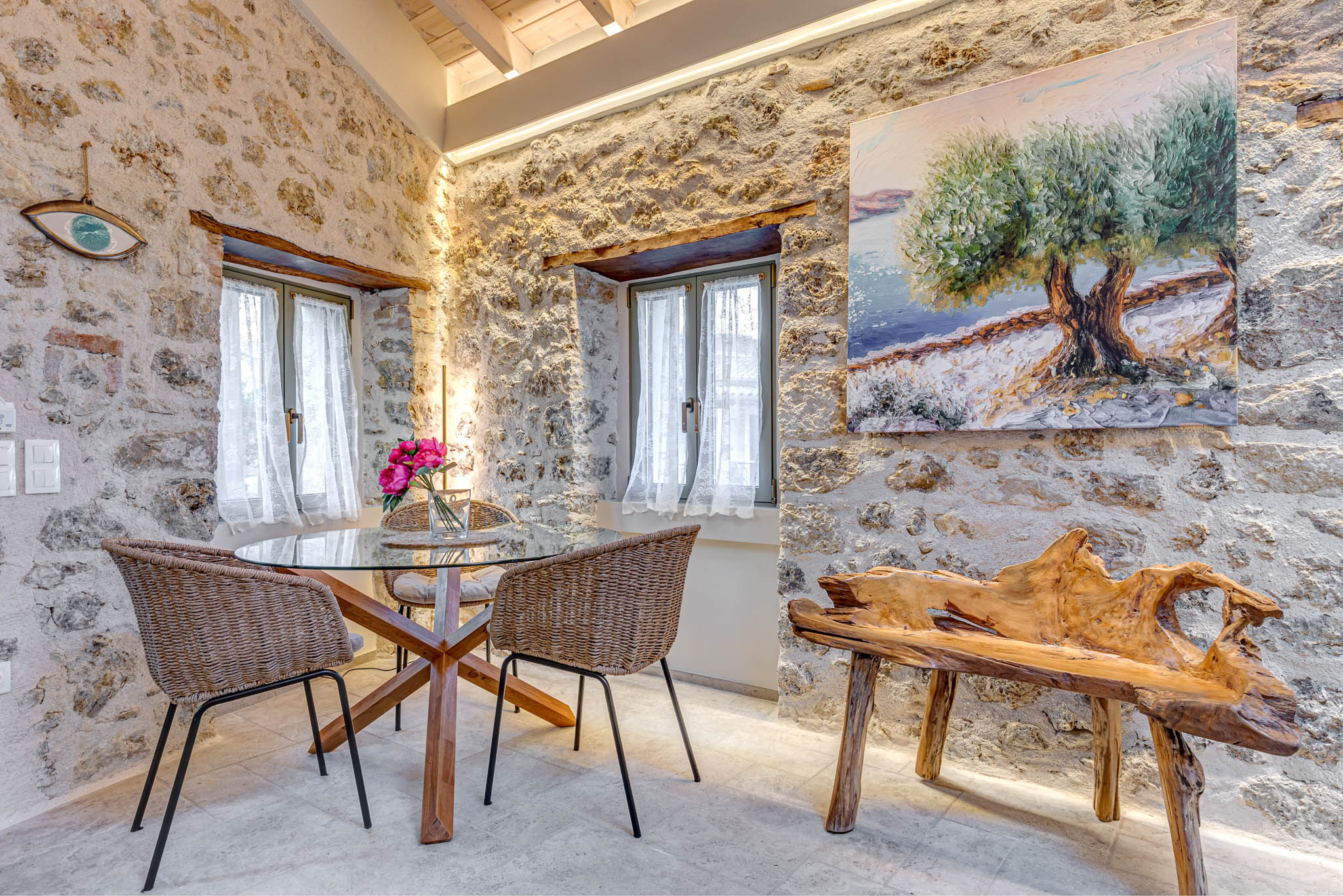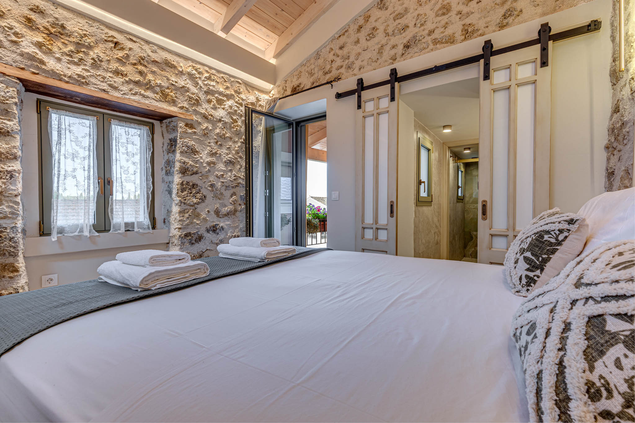 • Restored architectural features - exposed stone, reclaimed beams, arched niches - celebrating Doukades’ heritage.