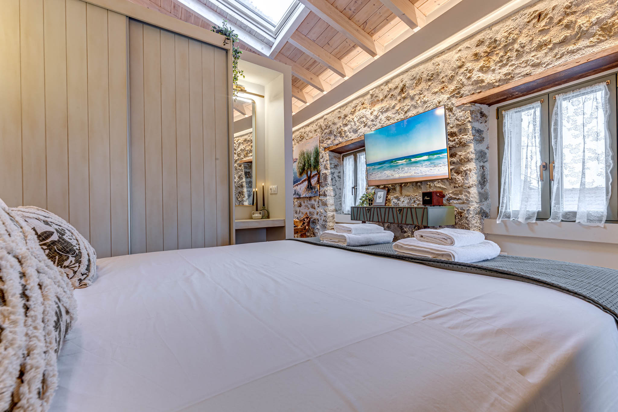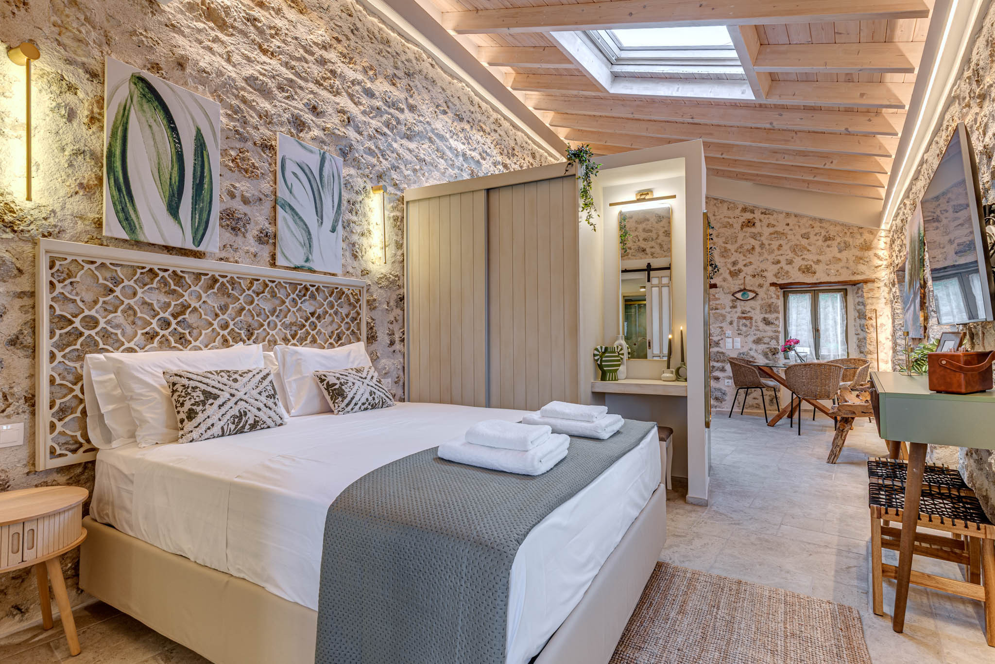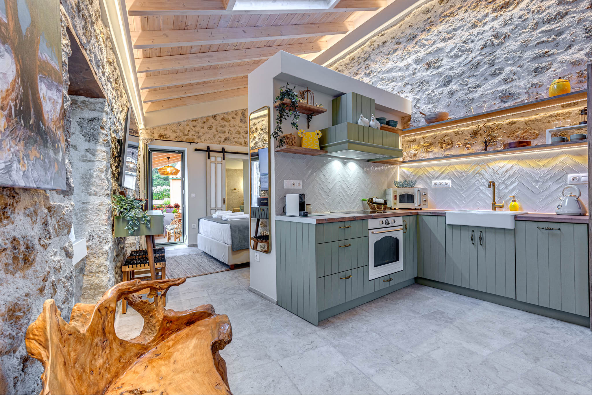 Inside, exposed stone walls, vaulted wooden ceilings, and soft ambient lighting create a calming, sophisticated ambiance. Skylight floods the space with natural light by day and offers a magical view of the starlit sky by night. The bespoke kitchen features a hand-painted finish, a farmhouse sink, and artisan stonework, while the bathroom boasts a sculptural natural stone basin and luxurious gold fixtures.