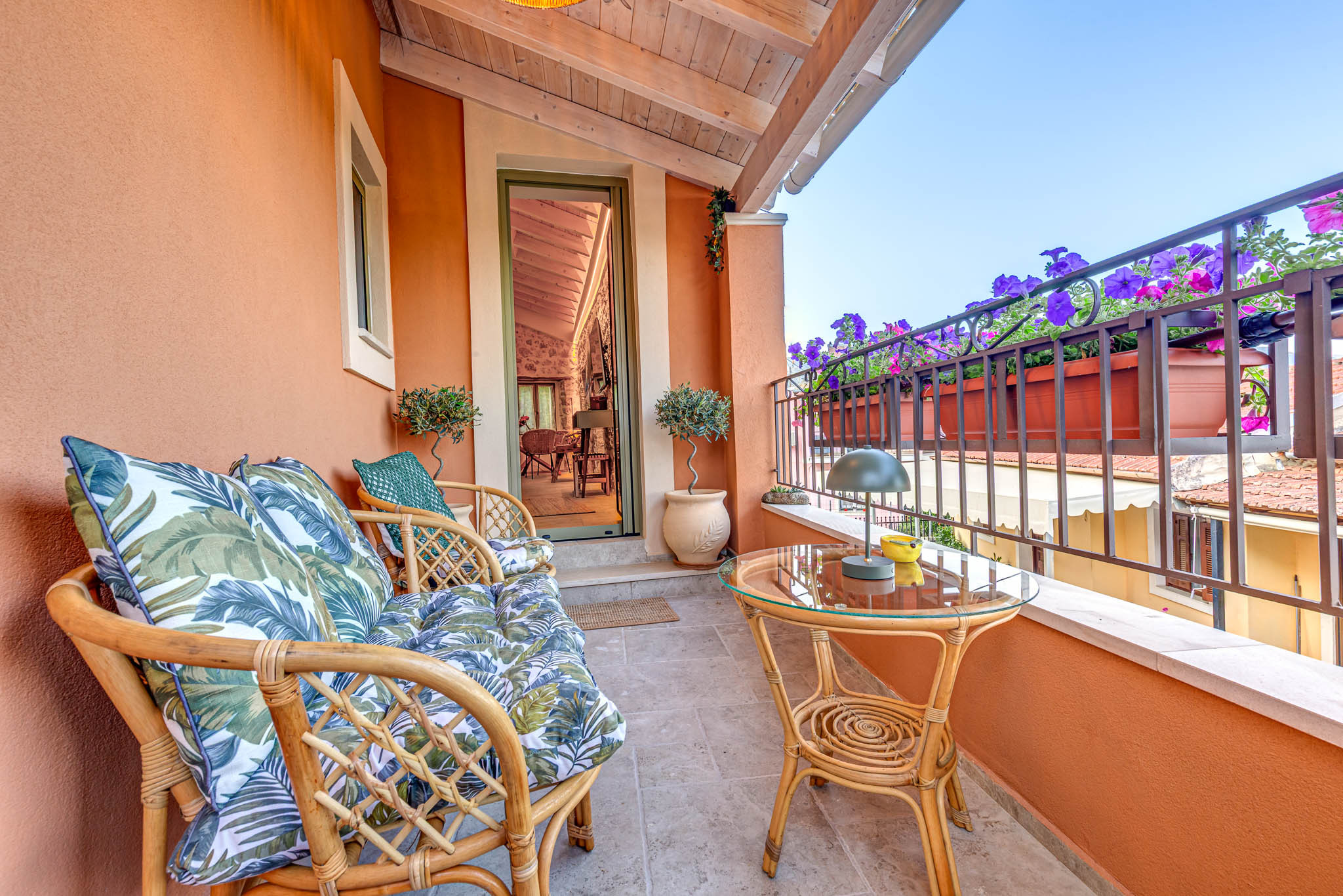 Step onto your private flower-lined balcony to sip your morning coffee or enjoy a sunset aperitif while gazing across terracotta rooftops and olive groves. Every detail has been curated for beauty and comfort, from the curated artwork and custom furnishings to the intimate lighting and organic textures throughout.