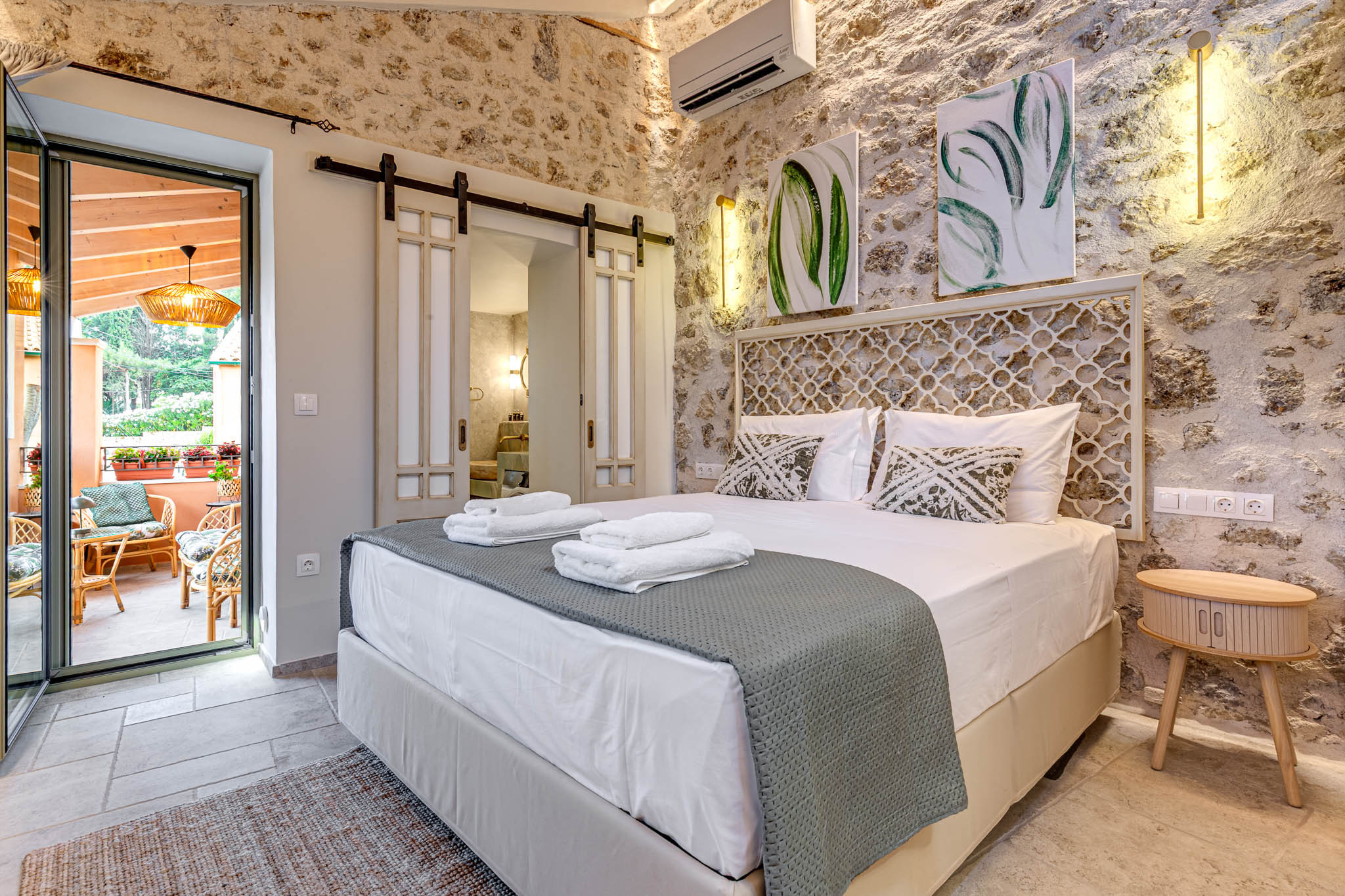 Tucked behind the warm terracotta façade of the historic Bótzos Residence, this ground-floor sanctuary pairs centuries-old stonework with contemporary island flair. Inside the open-plan studio, honey-toned ceiling beams, hand-chiseled limestone walls and woven rattan pendants cast a mellow glow over a space that feels at once timeless and fresh.