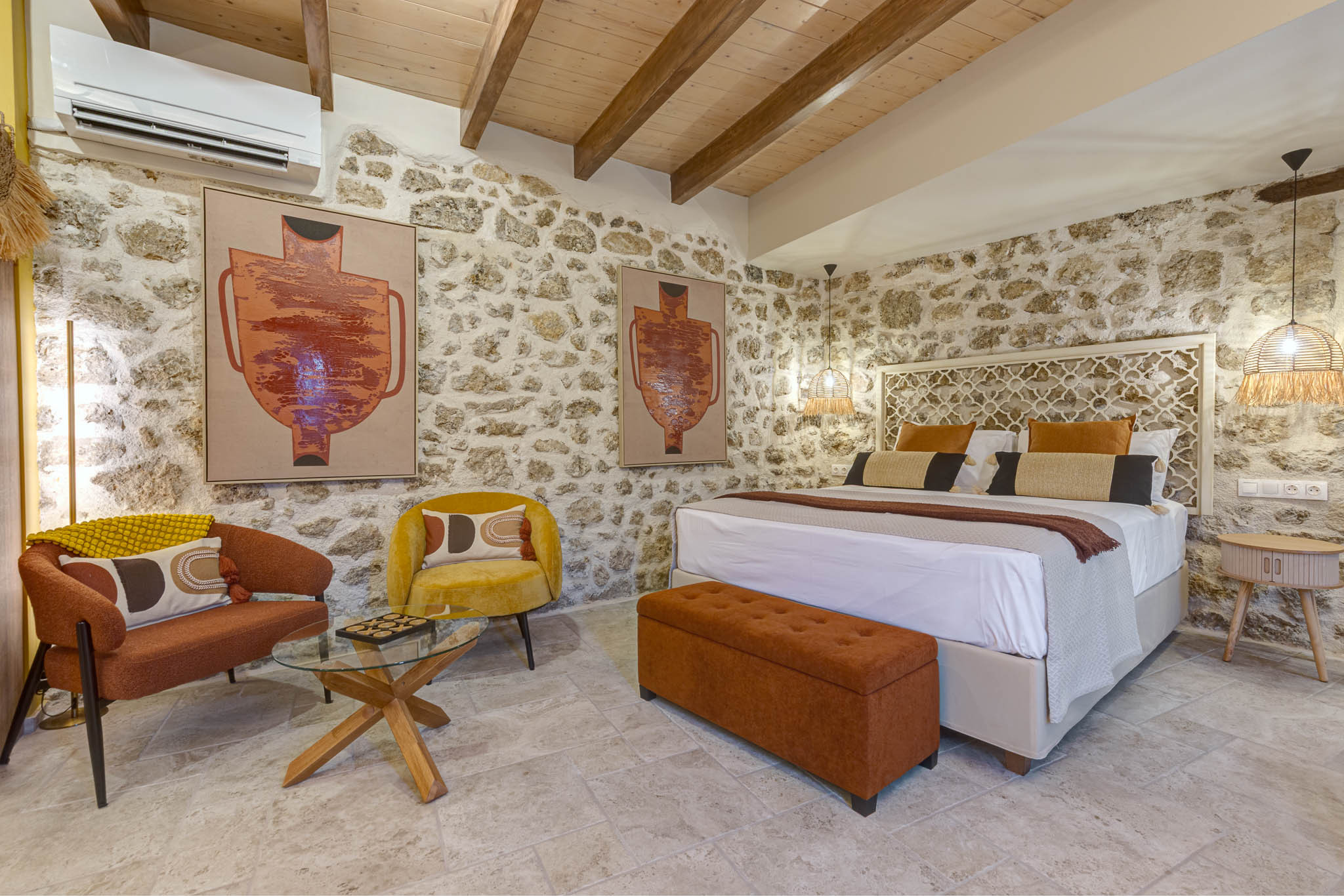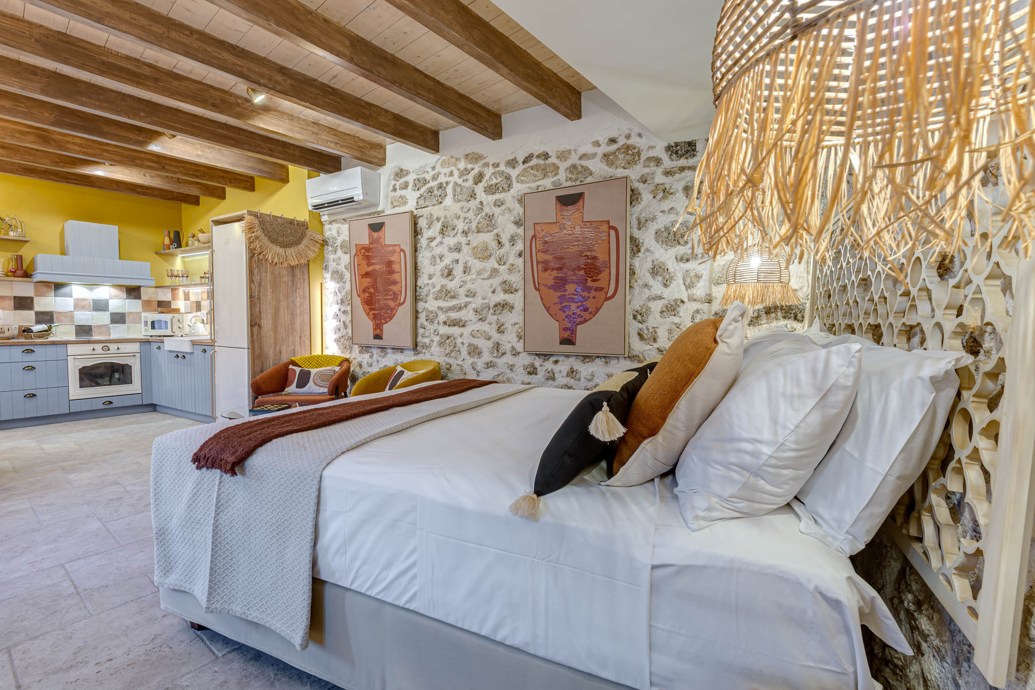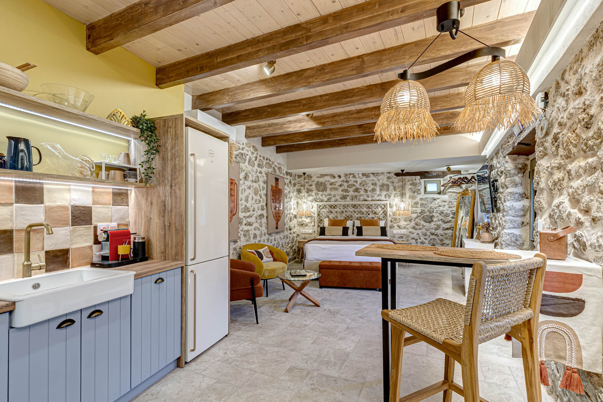 Tucked behind the warm terracotta façade of the historic Bótzos Residence, this ground-floor sanctuary pairs centuries-old stonework with contemporary island flair. Inside the open-plan studio, honey-toned ceiling beams, hand-chiseled limestone walls and woven rattan pendants cast a mellow glow over a space that feels at once timeless and fresh.