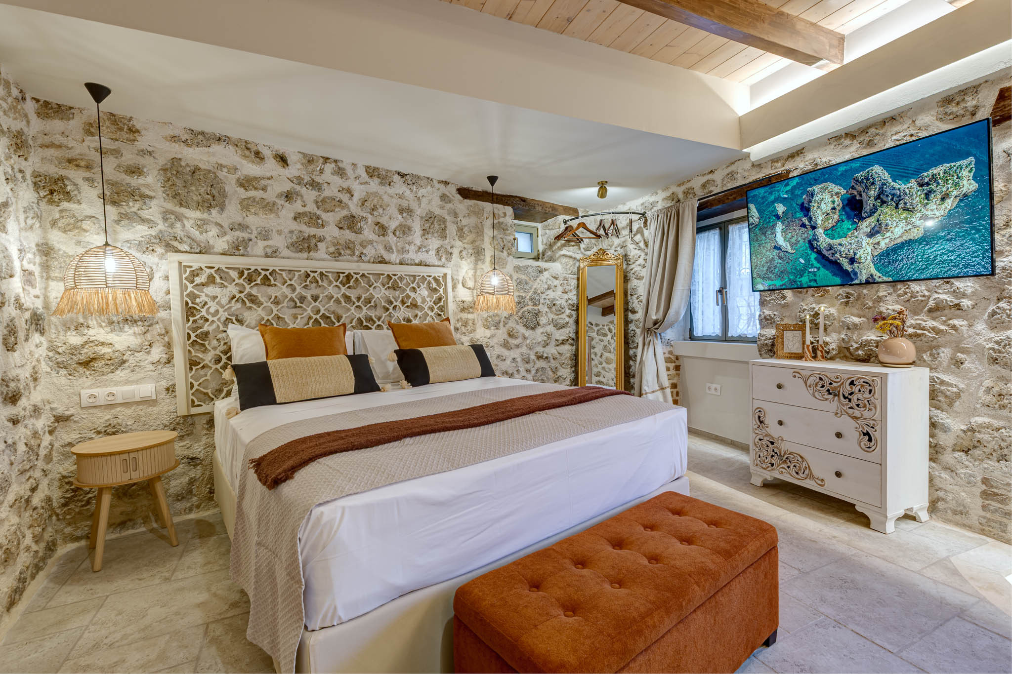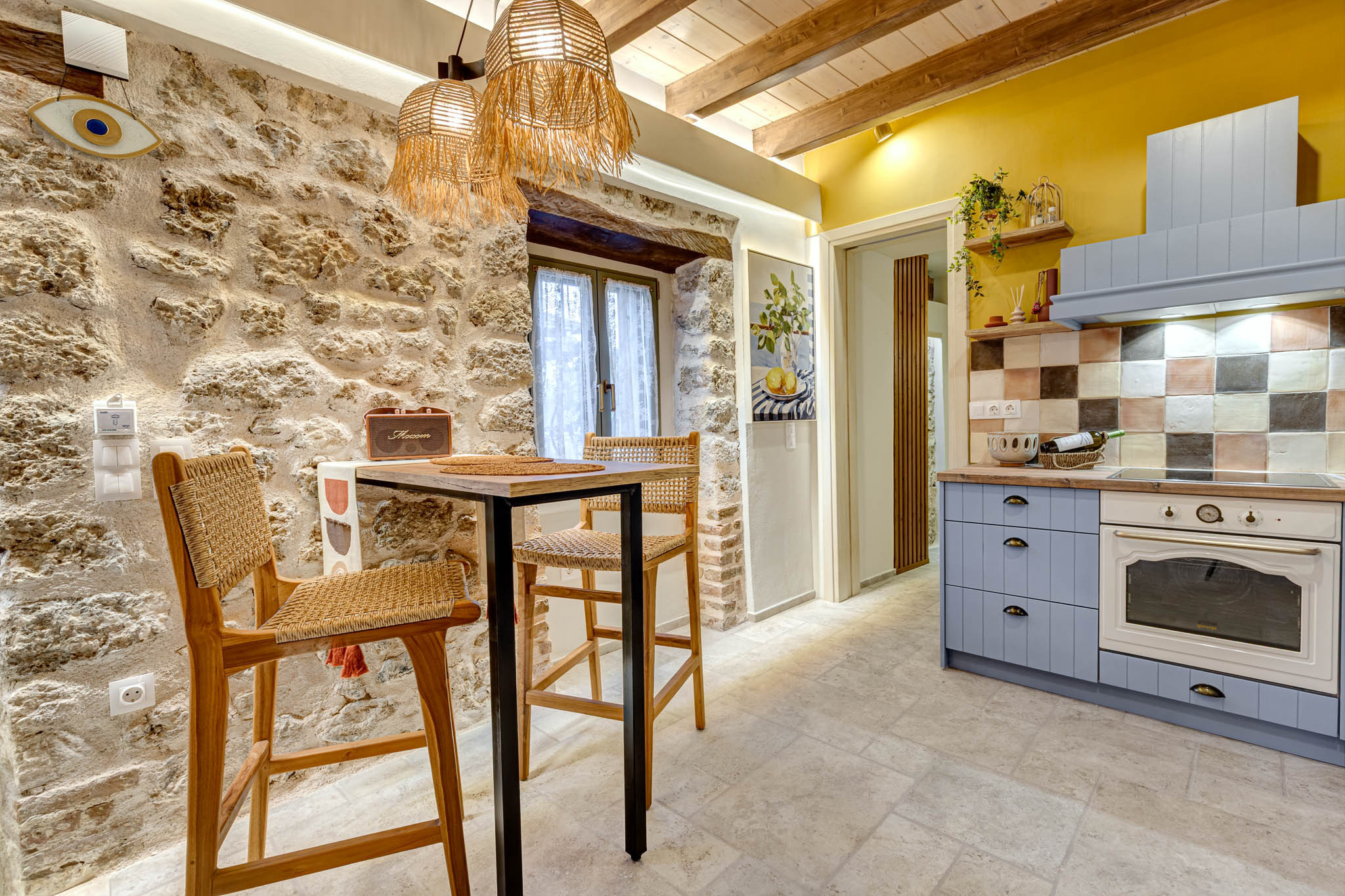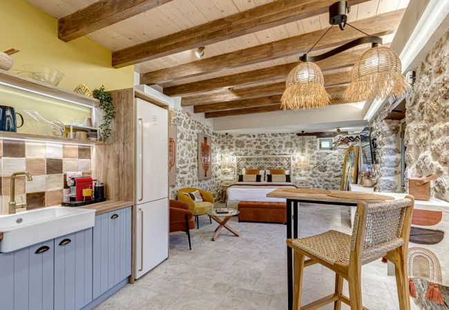 Tucked behind the warm terracotta façade of the historic Bótzos Residence, this ground-floor sanctuary pairs centuries-old stonework with contemporary island flair. Inside the open-plan studio, honey-toned ceiling beams, hand-chiseled limestone walls and woven rattan pendants cast a mellow glow over a space that feels at once timeless and fresh.