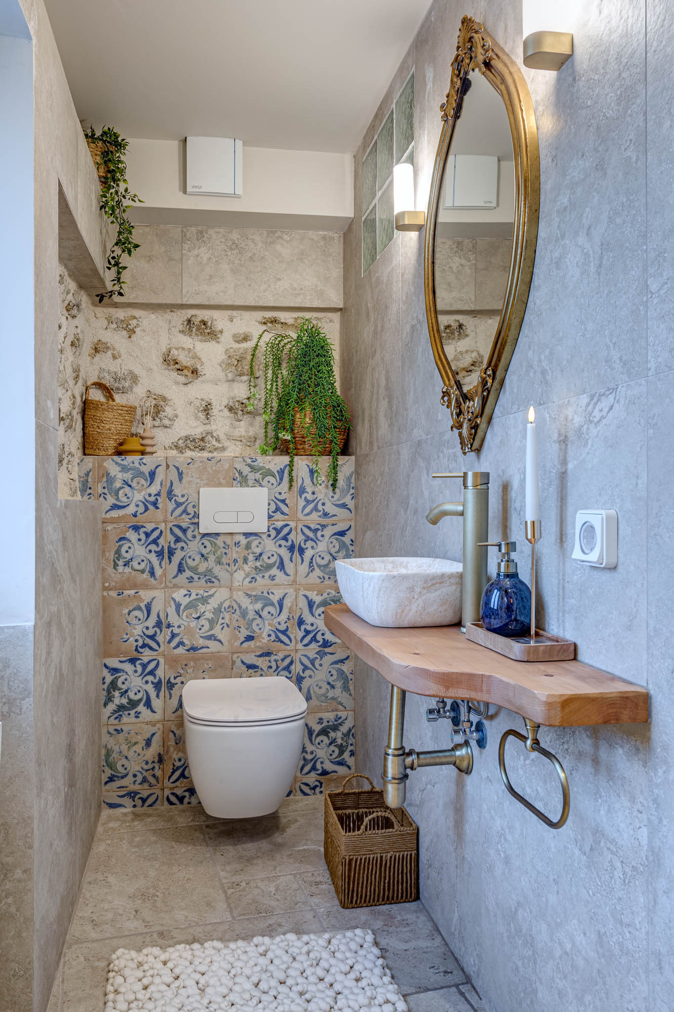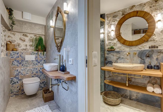 Inside, exposed stone walls, vaulted wooden ceilings, and soft ambient lighting create a calming, sophisticated ambiance. Skylight floods the space with natural light by day and offers a magical view of the starlit sky by night. The bespoke kitchen features a hand-painted finish, a farmhouse sink, and artisan stonework, while the bathroom boasts a sculptural natural stone basin and luxurious gold fixtures.