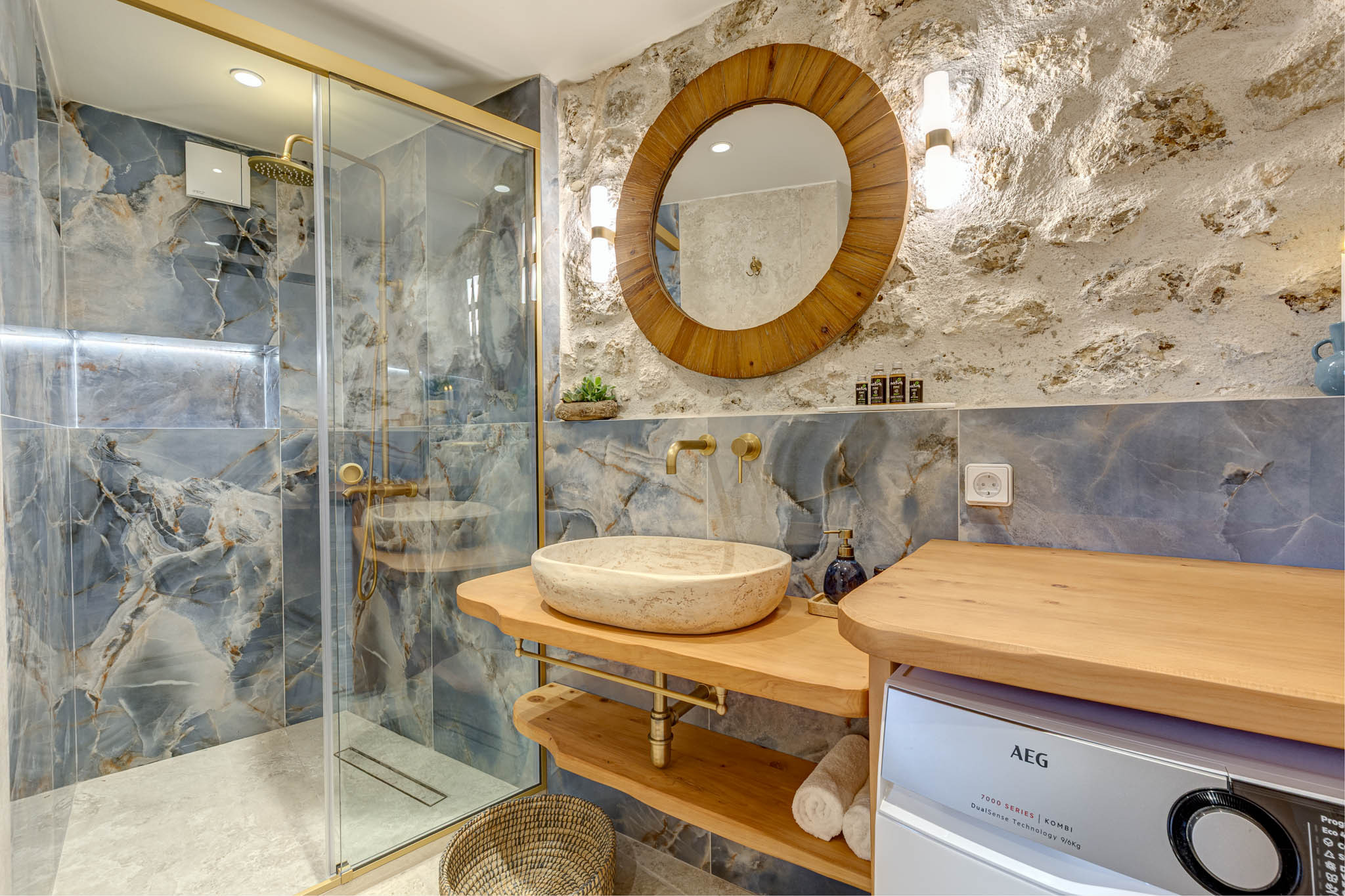 • Spa-worthy bathroom: sculpted stone basins, bespoke wooden vanities, brushed-gold fixtures and hand-painted heritage tiles; a walk-in rainfall shower delivers pure holiday bliss.
